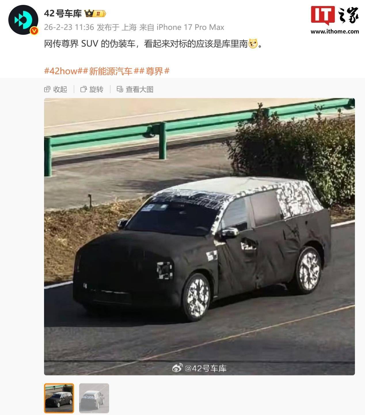 享了鸿蒙智行尊界 SUV 的伪装车照片博主 @42号车库 2 月 23 日分,的该当是库里南”称“看起来对标。异常观被遮挡固然新车大部,正造型的轮廓但依旧可见方,家族式分体大灯计划前脸局部希望延续,视镜计划可选并供给古板后。